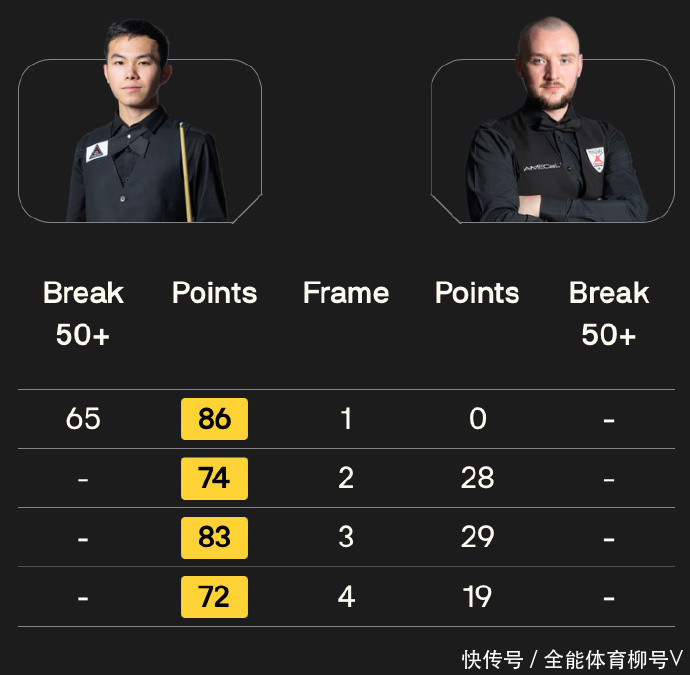 2025斯诺克英格兰公开赛履历赛,世锦赛冠军赵心童、“中国一哥”丁俊晖领衔中国斯诺克军团31东谈主出战。履历赛首个比赛日,共有傅家俊、江俊、黄佳浩、赵翰洋、王雨晨等5名中国选手奏凯晋级。其中,傅家俊以4-0获取与高阳的中国德比战奏凯,