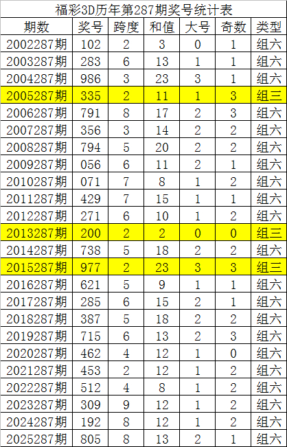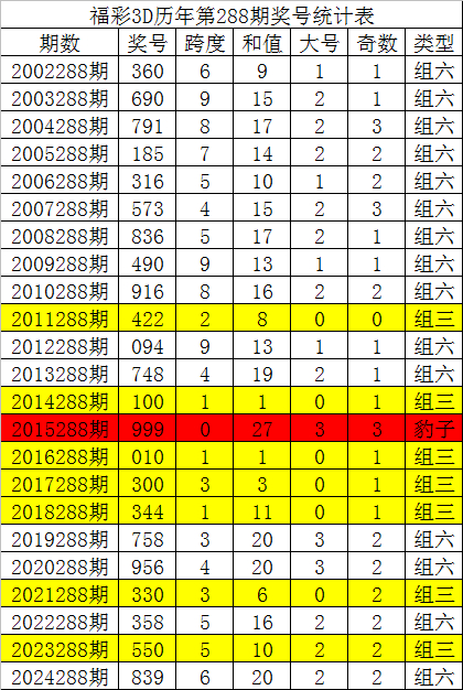 从以上统计不错看出,积年3D第288期开出了1次豹子号码,开出了7次组三号码,开出了15次组六号码。组六号码出现概率大,本期展望开出组六号码。