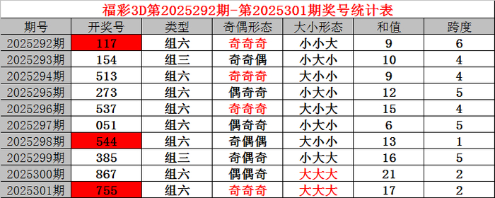 上期归来:福利彩票3D第2025301期开奖效果755。奖号:奇奇奇、大大大,和值17,跨度2。