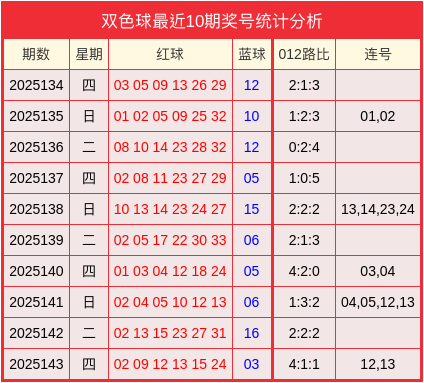 开奖转头:双色球2025143开奖号码为02、09、12、13、15、24+03。其中012路比为4:1:1、开出1组连号12,13。
