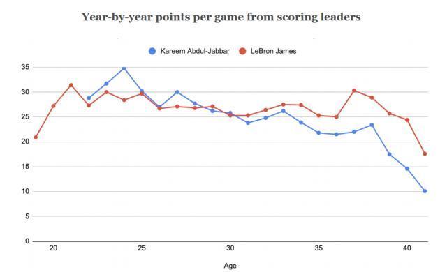 对于NBA历史上险些通盘其他球员来说,能打到40岁自己便是一项卓绝的设立。场均得到17.6分更是前所未有。此前在这个年岁的得分率先者是贾巴尔,他在41岁赛季场均得到10.1分,那是在漫长、渐进的软弱弧线终端。他临了一个场均至少24分的赛季是在33岁。