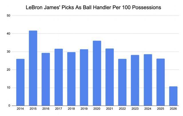 —詹姆斯每100回合使用7.1次单打,低于上赛季的11.4次。此前他从未低于9.1次。