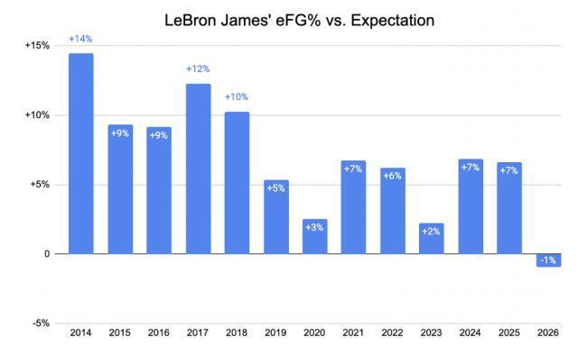 关系词在2025-26赛季,詹姆斯有记录以来初次略略低于其投篮质料预期的效用值。
