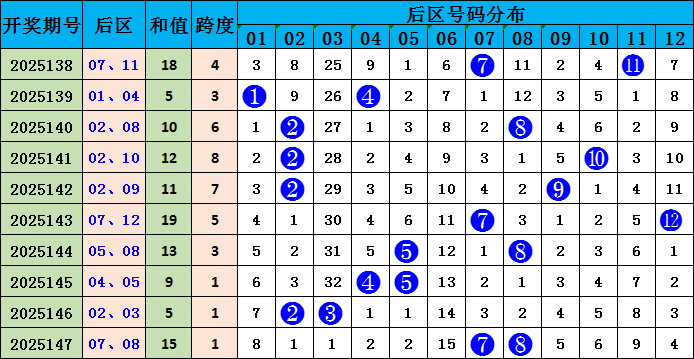 后诀别析:上期后区开出号码07、08,为大大奇偶组合。