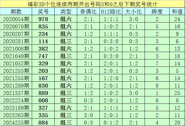 个位号码:最近两期个位开出号码为3-0,在福彩3D历史开奖中,前后两期个位分离开出号码3-0的奖号出现了83次。最近15期个位3-0组合出现之后,其下期奖号分离为:978-835-234-114-382-747-329-203-167-830-889-008-327-335-884;