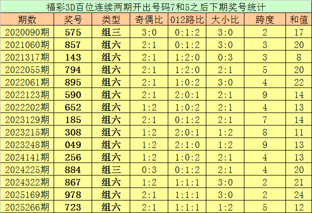 百位号码:流畅两期百位出号分离为:7-5,历史上福彩3D流畅两期前后分离出号7-5的奖号共出现81次。在百位7-5的奖号气候出当前,近15期下期分离出号:575-857-143-794-895-590-652-185-308-049-256-884-867-978-723;