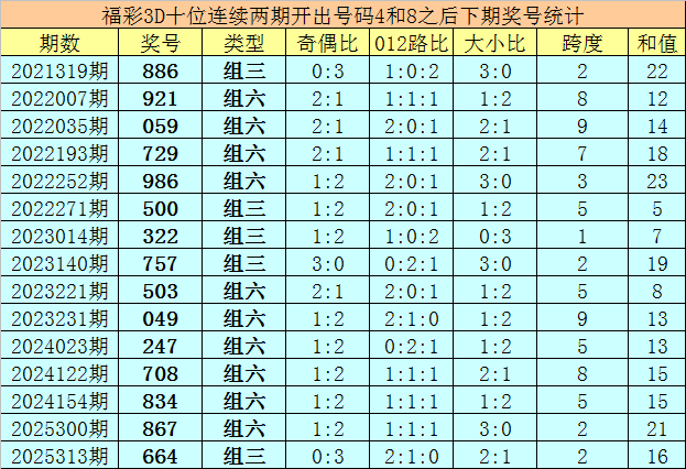 十位号码:前两期十位分离出现奖号4-8,历史上福彩3D流畅前后分离开出号码4-8的气候共开出96次。在十位4-8的气候出当前,最近15期其下期分离开出号码:886-921-059-729-986-500-322-757-503-049-247-708-834-867-664;